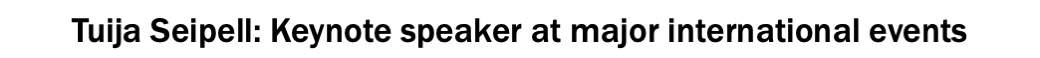 In April 2018, Tuija was keynote speaker at the Baltic for Events Forum in Tallinn, Estonia. This key meeting for event professionals from all over the Baltic Sea region attracted 250 participants and generated media coverage in nine countries. A post-session interview with Tuija (below) is posted on YouTube.